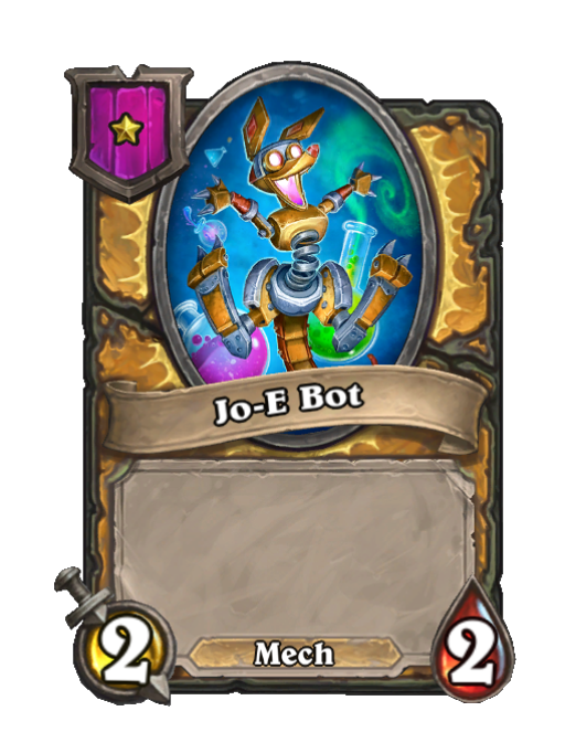 Jo-E Bot is a Tier 1 Mech Minion in Hearthstone Battlegrounds with 2/2 stats. Created by: Mecharoo. This card is no longer in the pool (Legacy).