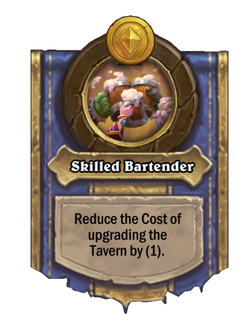 Skilled Bartender is a Hero Power in Hearthstone Battlegrounds. Effect: Reduce the Cost of upgrading the Tavern by (1). Created by: Bartendotron. This card is no longer in the pool (Legacy).