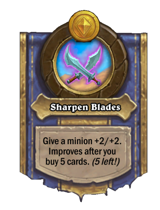Sharpen Blades is a Hero Power in Hearthstone Battlegrounds. Effect: Give a minion +2/+2. Improves after you buy 5 cards. (5 left!). Costs 1 Gold. Created by: Edwin VanCleef.