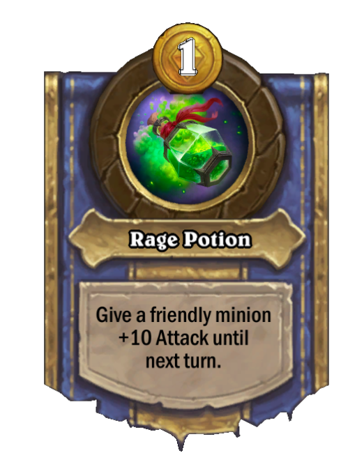 Rage Potion is a Hero Power in Hearthstone Battlegrounds. Effect: Give a friendly minion +10 Attack until next turn. Costs 1 Gold. This card is no longer in the pool (Legacy).
