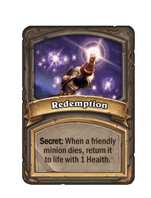 Redemption is a Spell in Hearthstone Battlegrounds featuring Secret. Effect: Secret: When a friendly minion dies, return it to life with 1 Health.