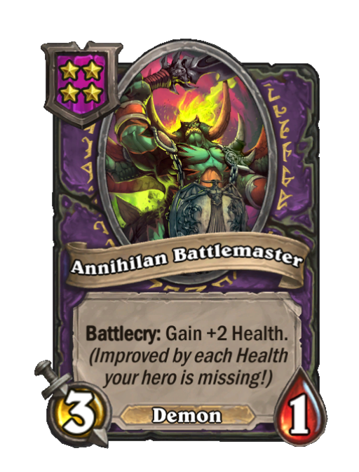 Annihilan Battlemaster is a Tier 4 Demon Minion in Hearthstone Battlegrounds with 3/1 stats featuring Battlecry. Effect: Battlecry: Gain +2 Health. (Improved by each Health your hero is missing!). This card is no longer in the pool (Legacy).