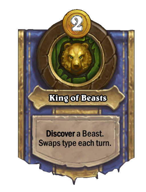 King of Beasts is a Hero Power in Hearthstone Battlegrounds featuring Discover. Effect: Discover a Beast. Swaps type each turn. Costs 2 Gold. This card is no longer in the pool (Legacy).
