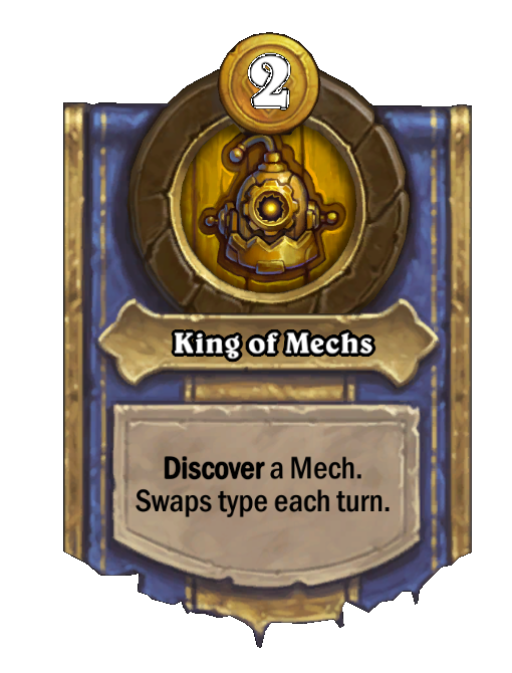 King of Mechs is a Hero Power in Hearthstone Battlegrounds featuring Discover. Effect: Discover a Mech. Swaps type each turn. Costs 2 Gold. This card is no longer in the pool (Legacy).