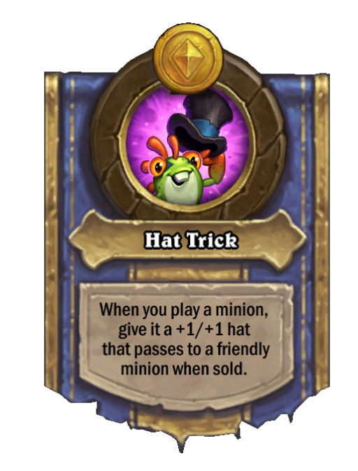 Hat Trick is a Hero Power in Hearthstone Battlegrounds. Effect: When you play a minion, give it a +1/+1 hat that passes to a friendly minion when sold. Created by: Dancin' Deryl.