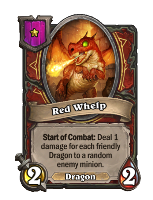 Red Whelp is a Tier 1 Dragon Minion in Hearthstone Battlegrounds with 2/2 stats featuring Start of Combat. Effect: Start of Combat: Deal 1 damage for each friendly Dragon to a random enemy minion. This card is no longer in the pool (Legacy).