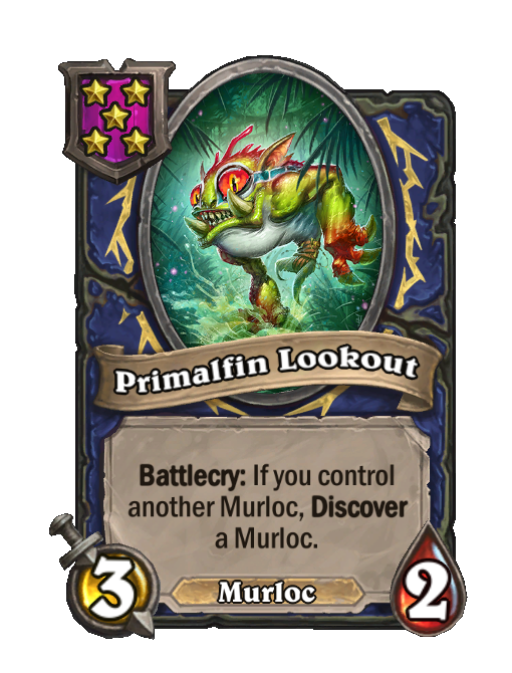 Primalfin Lookout is a Tier 5 Murloc Minion in Hearthstone Battlegrounds with 3/2 stats featuring Battlecry, Discover. Effect: Battlecry: If you control another Murloc, Discover a_Murloc.