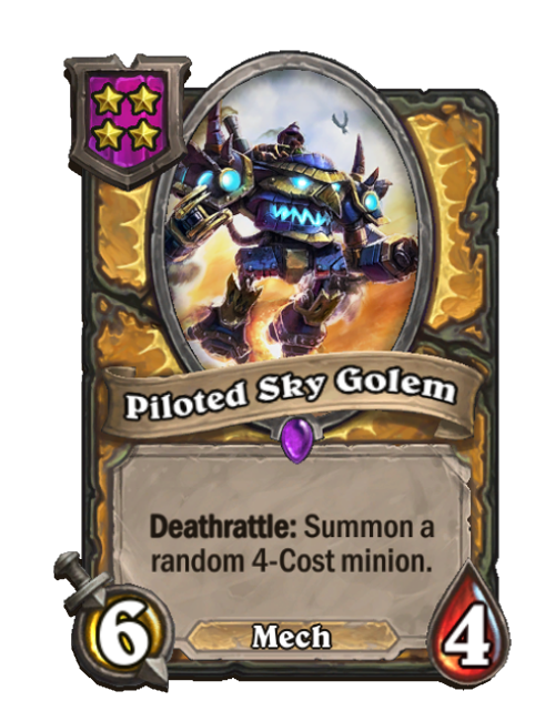 Piloted Sky Golem is a Tier 4 Mech Minion in Hearthstone Battlegrounds with 6/4 stats featuring Deathrattle. Effect: Deathrattle: Summon a random 4-Cost minion. This card is no longer in the pool (Legacy).
