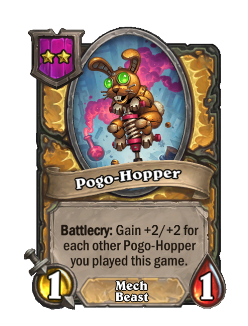 Pogo-Hopper is a Tier 2 Mech/Beast Minion in Hearthstone Battlegrounds with 1/1 stats featuring Battlecry. Effect: Battlecry: Gain +2/+2 for each other Pogo-Hopper you played this game. This card is no longer in the pool (Legacy).