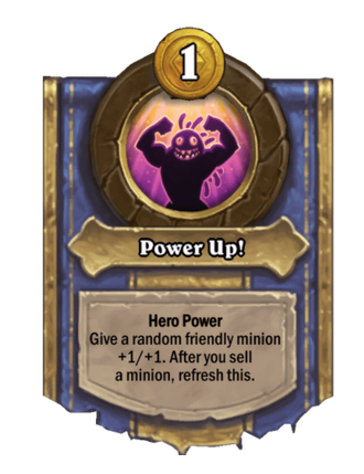 Power Up! is a Hero Power in Hearthstone Battlegrounds. Effect: Hero Power Give a random friendly minion +1/+1. After you sell a minion, refresh this. Costs 1 Gold. This card is no longer in the pool (Legacy).