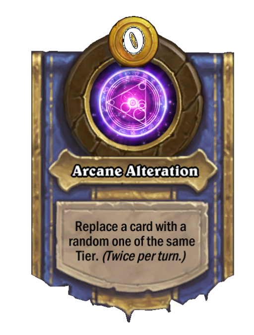 Arcane Alteration is a Hero Power in Hearthstone Battlegrounds. Effect: Replace a card with a random one of the same Tier. (Twice per turn.). Created by: Malygos.