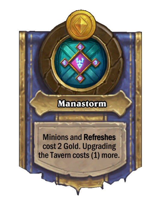 Manastorm is a Hero Power in Hearthstone Battlegrounds. Effect: Minions and Refreshes cost 2 Gold. Upgrading the Tavern costs (1) more. Created by: Millhouse Manastorm.