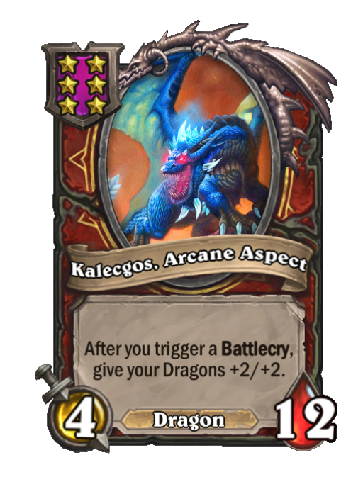 Kalecgos, Arcane Aspect is a Tier 6 Dragon Minion in Hearthstone Battlegrounds with 4/12 stats. Effect: After you trigger a Battlecry, give your Dragons +2/+2. This card is no longer in the pool (Legacy).