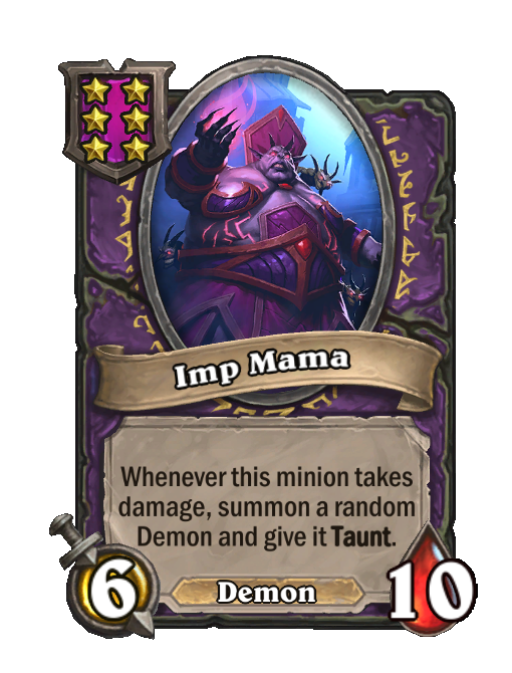 Imp Mama is a Tier 6 Demon Minion in Hearthstone Battlegrounds with 6/10 stats. Effect: Whenever this minion takes damage, summon a random Demon and give it Taunt. This card is no longer in the pool (Legacy).
