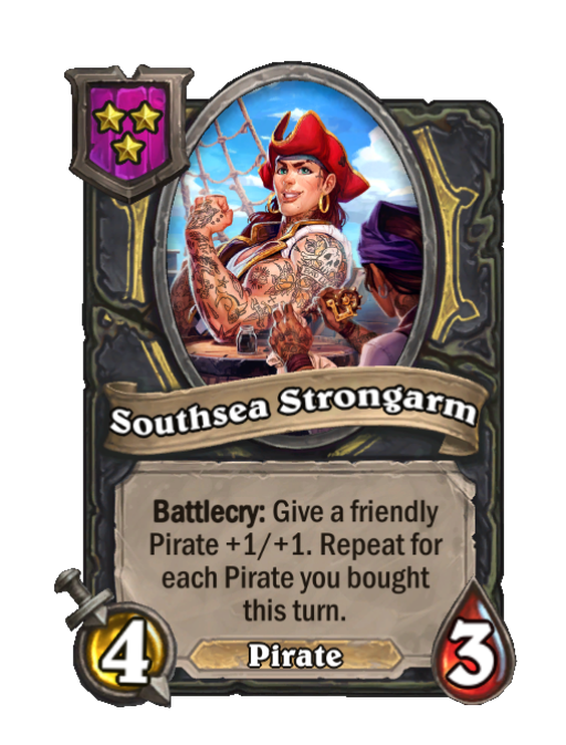Southsea Strongarm is a Tier 3 Pirate Minion in Hearthstone Battlegrounds with 4/3 stats featuring Battlecry. Effect: Battlecry: Give a friendly Pirate +1/+1. Repeat for each Pirate you bought this turn. This card is no longer in the pool (Legacy).