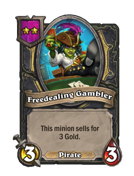 Freedealing Gambler is a Tier 2 Pirate Minion in Hearthstone Battlegrounds with 3/3 stats. Effect: This minion sells for 3 Gold.