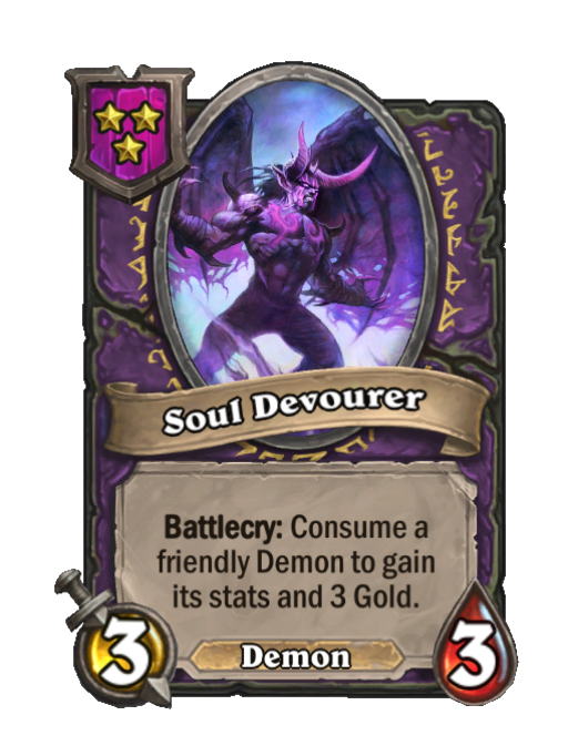 Soul Devourer is a Tier 3 Demon Minion in Hearthstone Battlegrounds with 3/3 stats featuring Battlecry. Effect: Battlecry: Consume a friendly Demon to gain its stats and 3 Gold. This card is no longer in the pool (Legacy).