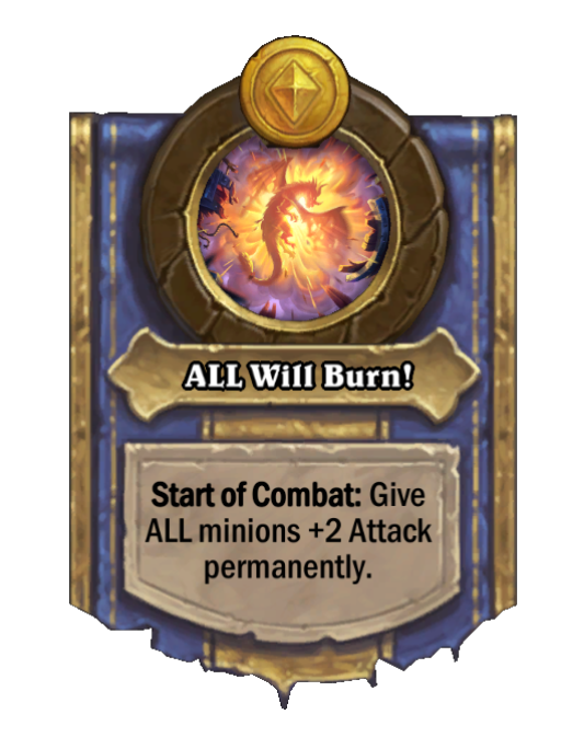 ALL Will Burn! is a Hero Power in Hearthstone Battlegrounds featuring Start of Combat. Effect: Start of Combat: Give ALL minions +2 Attack permanently. Created by: Deathwing.
