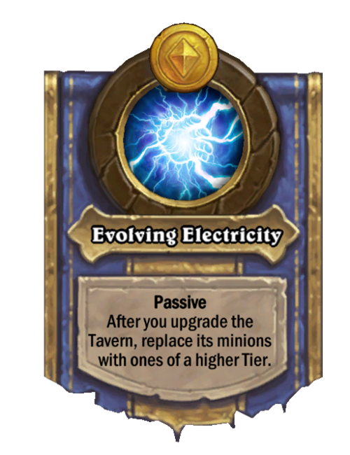 Evolving Electricity is a Hero Power in Hearthstone Battlegrounds. Effect: Passive After you upgrade the Tavern, replace its minions with ones of a higher Tier. This card is no longer in the pool (Legacy).