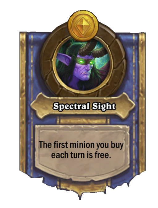 Spectral Sight is a Hero Power in Hearthstone Battlegrounds. Effect: The first minion you buy each turn is free. Created by: Aranna, Unleashed. This card is no longer in the pool (Legacy).