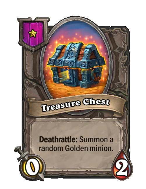 Treasure Chest is a Tier 1 Minion in Hearthstone Battlegrounds with 0/2 stats featuring Deathrattle. Effect: Deathrattle: Summon a random Golden minion. This card is no longer in the pool (Legacy).