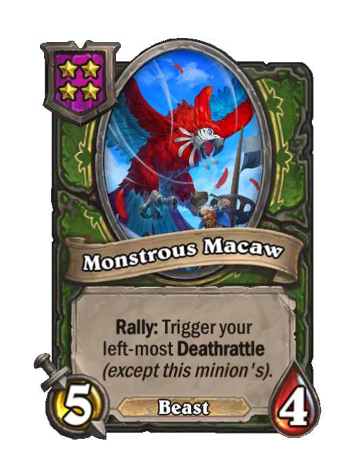 Monstrous Macaw is a Tier 4 Beast Minion in Hearthstone Battlegrounds with 5/4 stats featuring Rally. Effect: Rally: Trigger your left-most Deathrattle __(except this minion's).