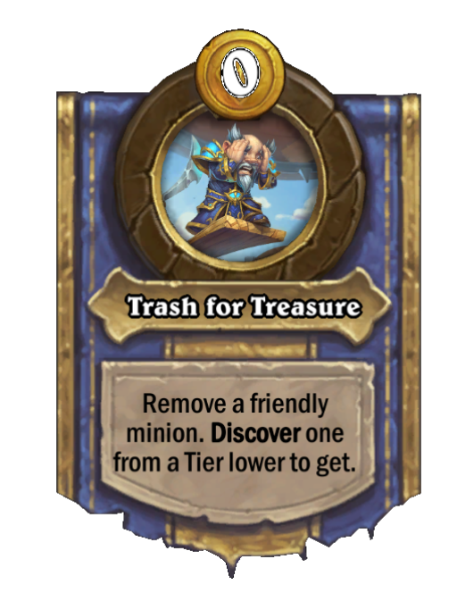 Trash for Treasure is a Hero Power in Hearthstone Battlegrounds featuring Discover. Effect: Remove a friendly minion. Discover one from a Tier lower to get. Created by: Captain Hooktusk.