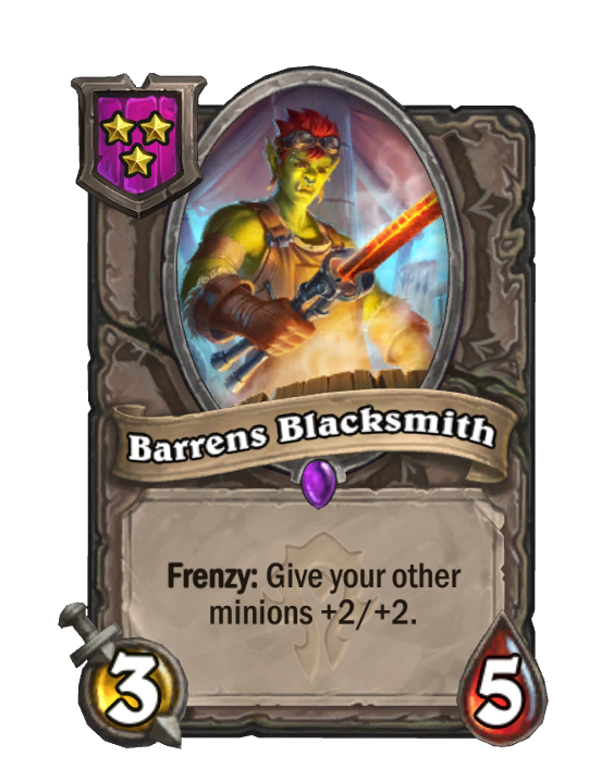 Barrens Blacksmith is a Tier 3 Minion in Hearthstone Battlegrounds with 3/5 stats featuring Frenzy. Effect: Frenzy: Give your other minions +2/+2. This card is no longer in the pool (Legacy).