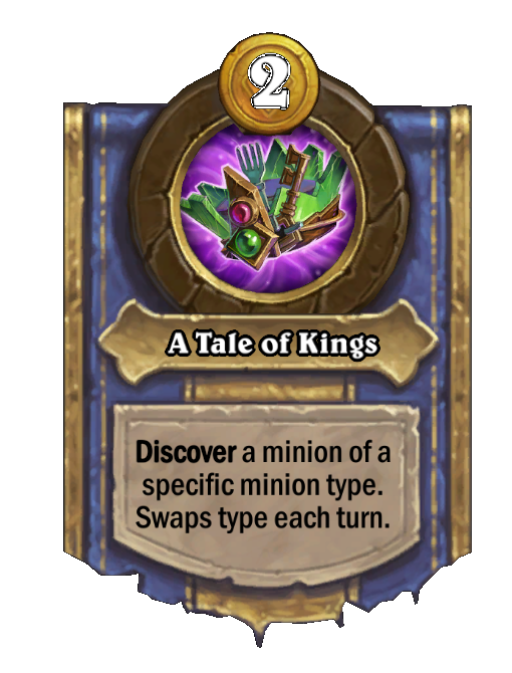 A Tale of Kings is a Hero Power in Hearthstone Battlegrounds featuring Discover. Effect: Discover a minion of a specific minion type. Swaps type each turn. Costs 2 Gold. Created by: The Rat King.