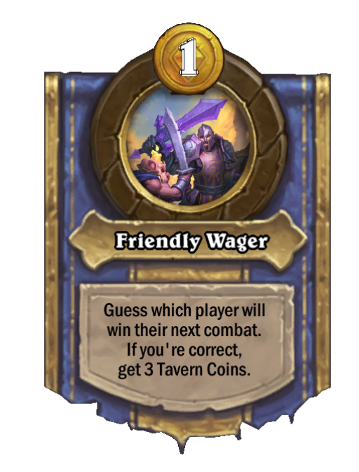 Friendly Wager is a Hero Power in Hearthstone Battlegrounds. Effect: Guess which player will win their next combat. If you're correct, get 3 Tavern Coins. Costs 1 Gold. Created by: Lord Barov. This card is no longer in the pool (Legacy).