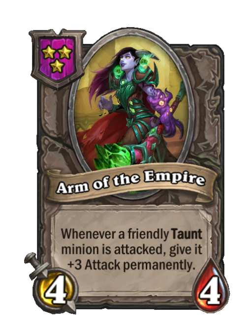 Arm of the Empire is a Tier 3 Minion in Hearthstone Battlegrounds with 4/4 stats. Effect: Whenever a friendly Taunt minion is attacked, give it +3 Attack permanently. This card is no longer in the pool (Legacy).