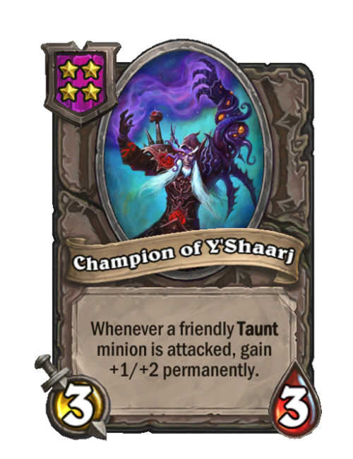 Champion of Y'Shaarj is a Tier 4 Minion in Hearthstone Battlegrounds with 3/3 stats. Effect: Whenever a friendly Taunt minion is attacked, gain +1/+2 permanently. This card is no longer in the pool (Legacy).