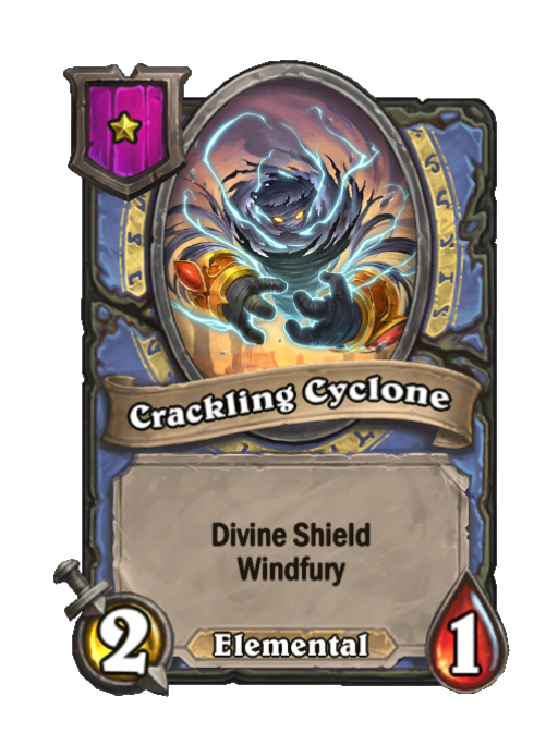 Crackling Cyclone is a Tier 1 Elemental Minion in Hearthstone Battlegrounds with 2/1 stats featuring Divine Shield, Windfury. Effect: Divine Shield Windfury.