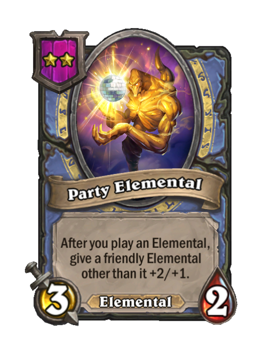 Party Elemental is a Tier 2 Elemental Minion in Hearthstone Battlegrounds with 3/2 stats. Effect: After you play an Elemental, give a friendly Elemental other than it +2/+1. This card is no longer in the pool (Legacy).