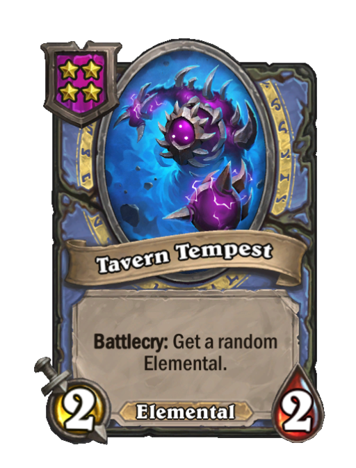 Tavern Tempest is a Tier 4 Elemental Minion in Hearthstone Battlegrounds with 2/2 stats featuring Battlecry. Effect: Battlecry: Get a random Elemental.