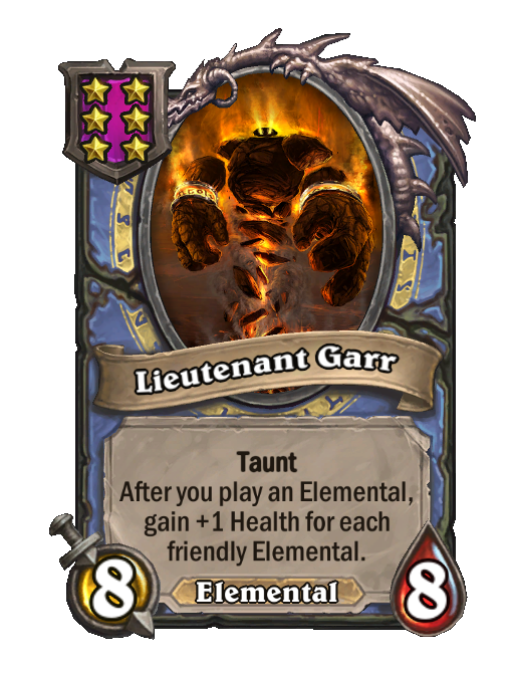 Lieutenant Garr is a Tier 6 Elemental Minion in Hearthstone Battlegrounds with 8/8 stats featuring Taunt. Effect: Taunt After you play an Elemental, gain +1 Health for each friendly Elemental. This card is no longer in the pool (Legacy).