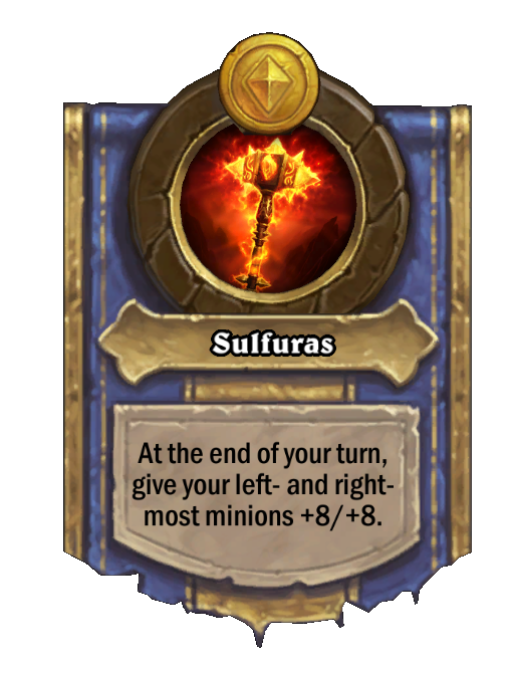 Sulfuras is a Hero Power in Hearthstone Battlegrounds featuring End of Turn. Effect: At the end of your turn, give your left- and right- most minions +8/+8. Created by: BUY, INSECT!.