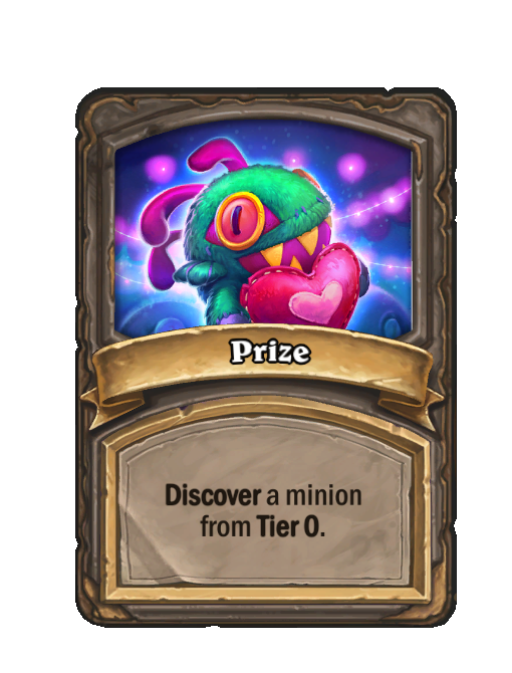 Prize is a Spell in Hearthstone Battlegrounds featuring Discover. Effect: Discover a minion from Tier 0. Created by: Come One, Come All!.
