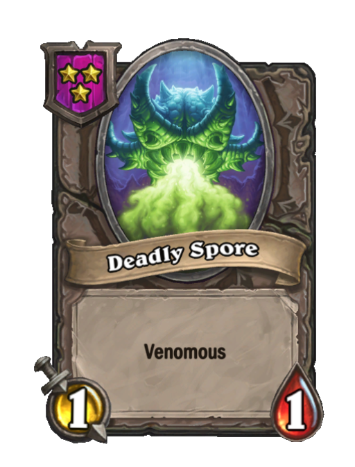 Deadly Spore is a Tier 3 Minion in Hearthstone Battlegrounds with 1/1 stats featuring Venomous. Effect: Venomous.