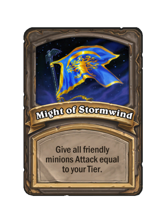 Might of Stormwind is a Tier 1 Spell in Hearthstone Battlegrounds (Darkmoon). Effect: Give all friendly minions Attack equal to your Tier. This card is no longer in the pool (Legacy).