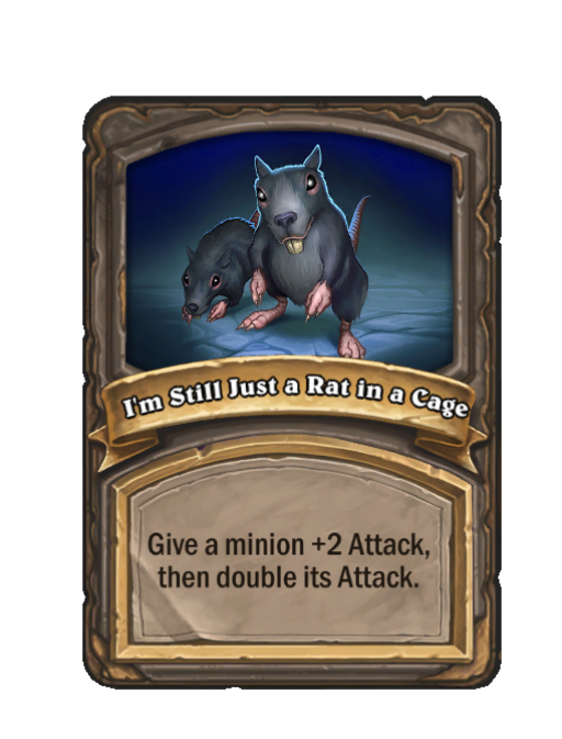 I'm Still Just a Rat in a Cage is a Tier 2 Spell in Hearthstone Battlegrounds (Darkmoon). Effect: Give a minion +2 Attack, then double its Attack. This card is no longer in the pool (Legacy).