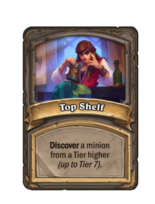 Top Shelf is a Tier 3 Spell in Hearthstone Battlegrounds featuring Discover (Darkmoon). Effect: Discover a minion from a Tier higher (up to Tier 7). This card is no longer in the pool (Legacy).