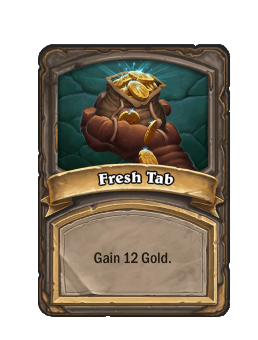 Fresh Tab is a Tier 4 Spell in Hearthstone Battlegrounds (Darkmoon). Effect: Gain 12 Gold. This card is no longer in the pool (Legacy).