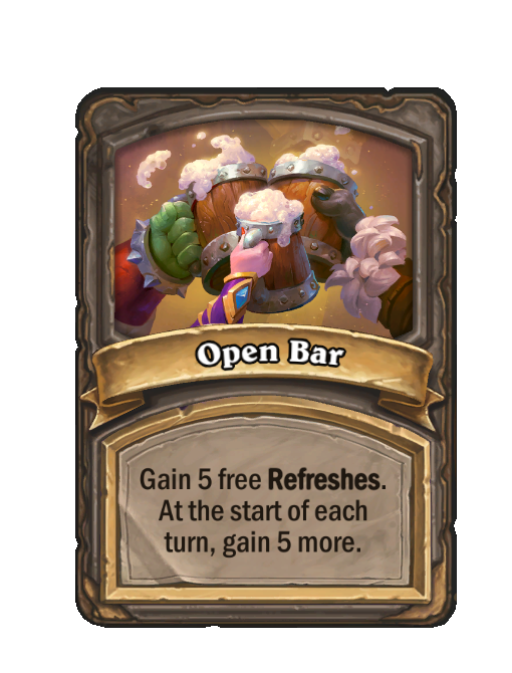 Open Bar is a Tier 4 Spell in Hearthstone Battlegrounds (Darkmoon). Effect: Gain 5 free Refreshes. At the start of each turn, gain 5 more. This card is no longer in the pool (Legacy).