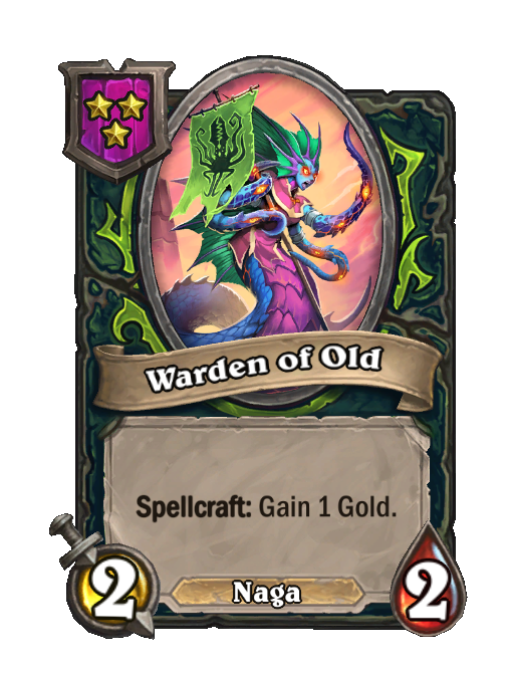 Warden of Old is a Tier 3 Naga Minion in Hearthstone Battlegrounds with 2/2 stats featuring Spellcraft. Effect: Spellcraft: Gain 1 Gold. This card is no longer in the pool (Legacy).