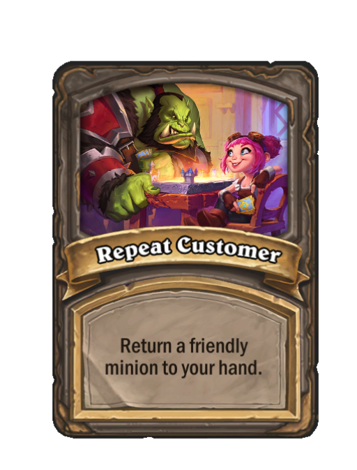 Repeat Customer is a Tier 3 Spell in Hearthstone Battlegrounds (Darkmoon). Effect: Return a friendly minion to your hand. This card is no longer in the pool (Legacy).