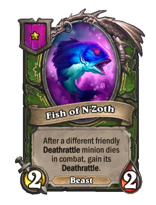 Fish of N'Zoth is a Tier 1 Beast Minion in Hearthstone Battlegrounds with 2/2 stats. Effect: After a different friendly Deathrattle minion dies in combat, gain its Deathrattle. Created by: Avatar of N'Zoth.