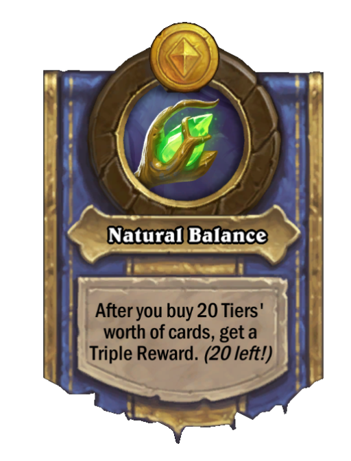 Natural Balance is a Hero Power in Hearthstone Battlegrounds. Effect: After you buy 20 Tiers' worth of cards, get a Triple Reward. (20 left!). Created by: Guff Runetotem.