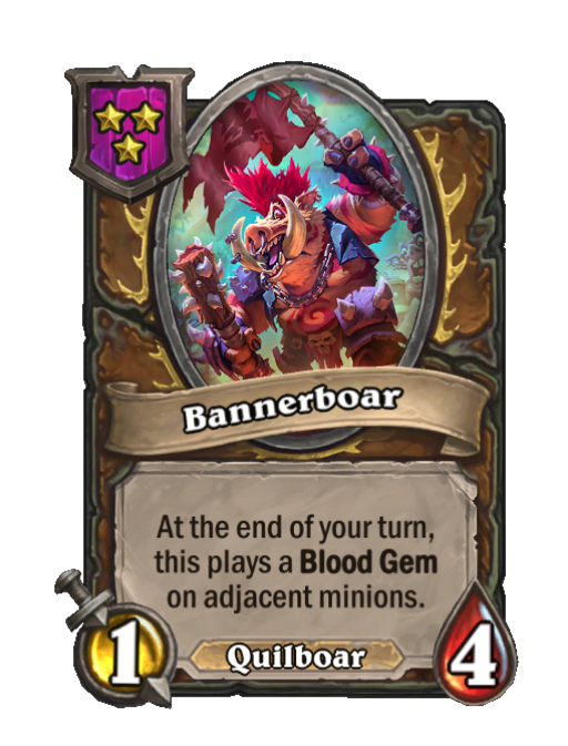 Bannerboar is a Tier 3 Quilboar Minion in Hearthstone Battlegrounds with 1/4 stats featuring End of Turn. Effect: At the end of your turn, this plays a Blood Gem on adjacent minions. This card is no longer in the pool (Legacy).