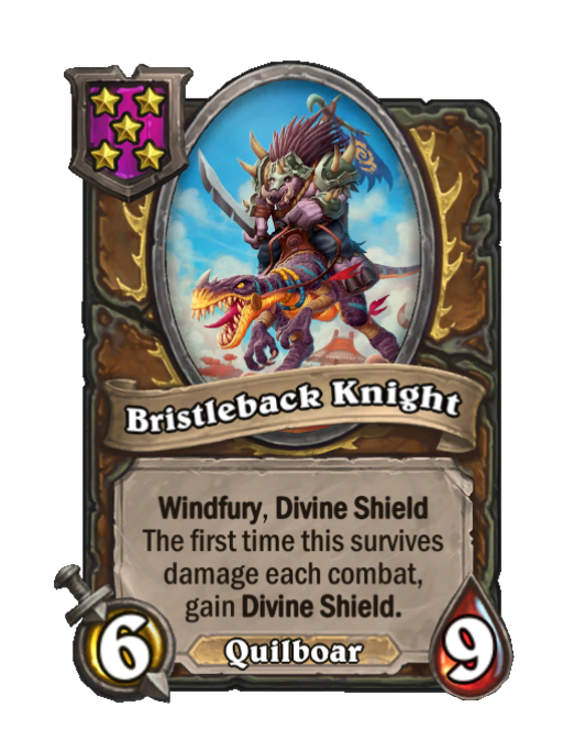 Bristleback Knight is a Tier 5 Quilboar Minion in Hearthstone Battlegrounds with 6/9 stats featuring Divine Shield, Windfury. Effect: Windfury, Divine Shield The first time this survives damage each combat, gain Divine Shield. This card is no longer in the pool (Legacy).